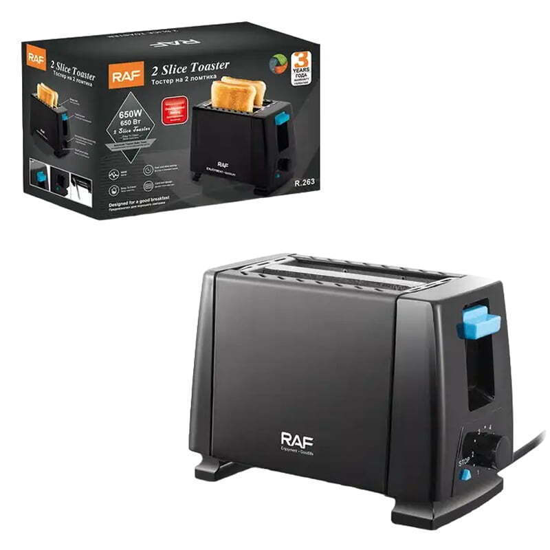 Η φρυγανιέρα Raf R.263 διαθέτει ισχύ 650 Watt και υποδοχές για 2 φέτες ψωμιού. Μπορεί να εξυπηρετήσει τις ανάγκες ενός ή και δύο ατόμων για την καθημερινή παρασκευή του πρωινού ή του σνακ.